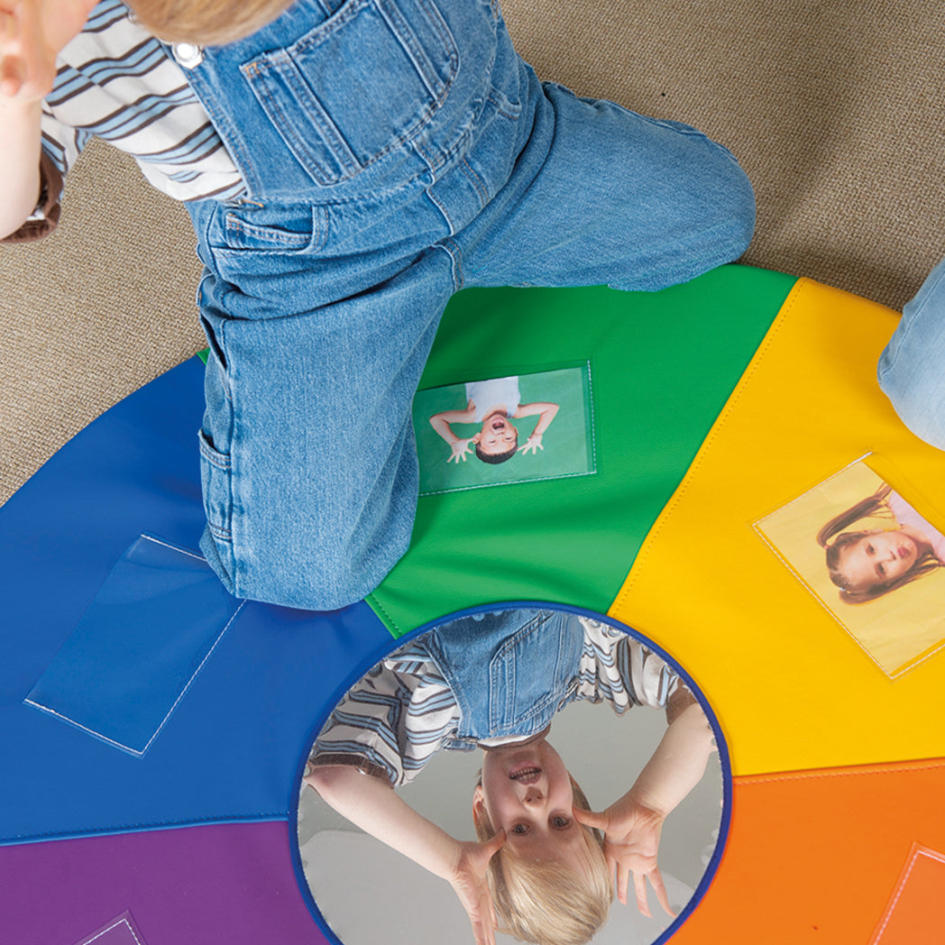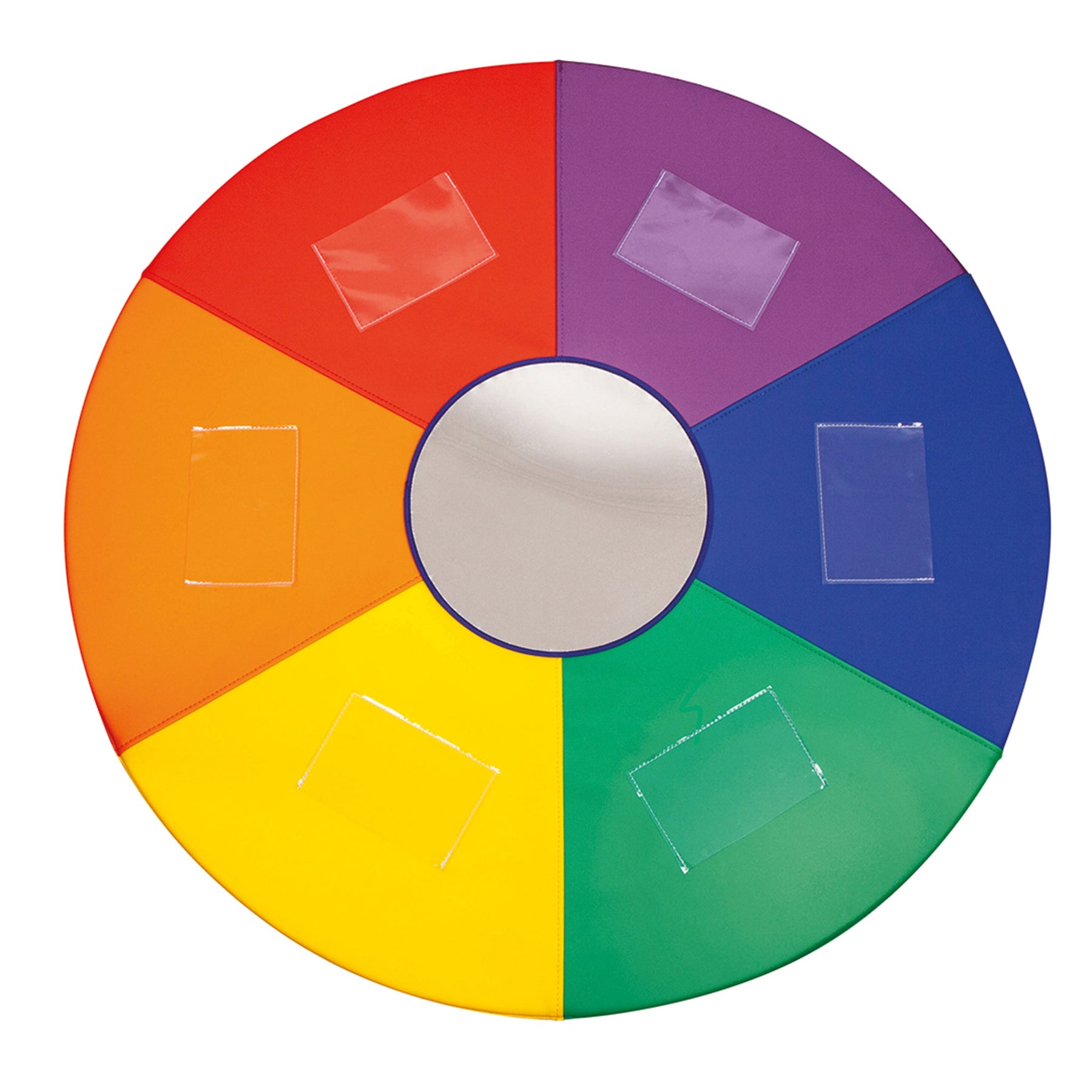 Denna mjuka interaktionsring erbjuder en lekfull och kreativ miljö. Ringen är uppdelad i färgglada segment, och varje del har en praktisk platsficka där olika teman kan sättas in. Möjligheterna är många – använd siffror för att skapa ordning, sätt in bilder på djur och låt barnen härma djurens läten och rörelser, eller välj roliga grimaser som barnen kan imitera. Produkten uppmuntrar öppen lek och ger stora möjligheter till inlärning genom rörelse och samspel. Rekommenderas för barn från 3 år.
