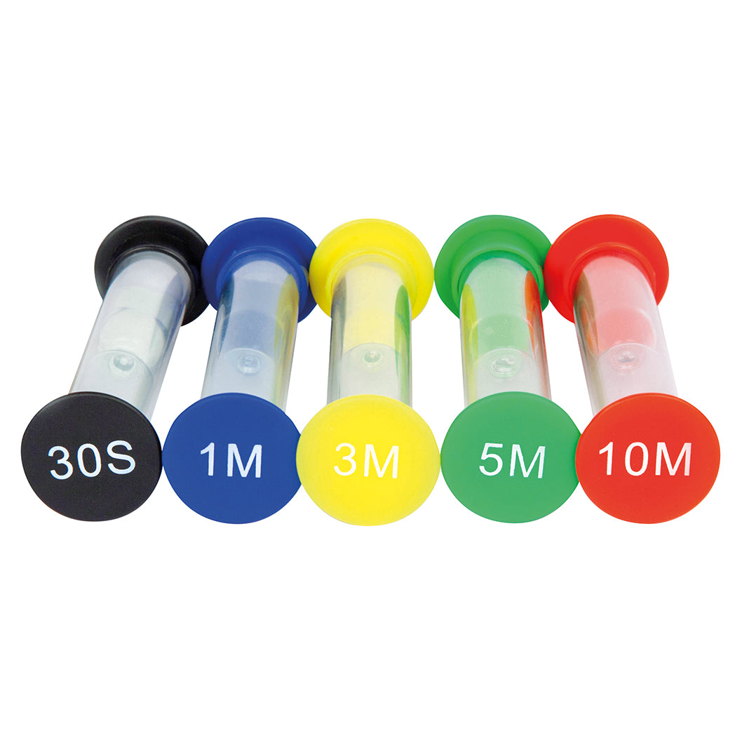 Mini timglas är ett enkelt och effektivt sätt att skapa struktur och lugn i klassrummet. Med tidsintervaller på 30 sekunder, 1 minut, 3 minuter, 5 minuter och 10 minuter blir det lättare för barn och ungdomar att förstå och hantera tid vid övningar, grupparbeten, spel eller korta pauser. Ett praktiskt hjälpmedel som främjar fokus och minskar stress under inlärning. Rekommenderas för barn från 3 år.