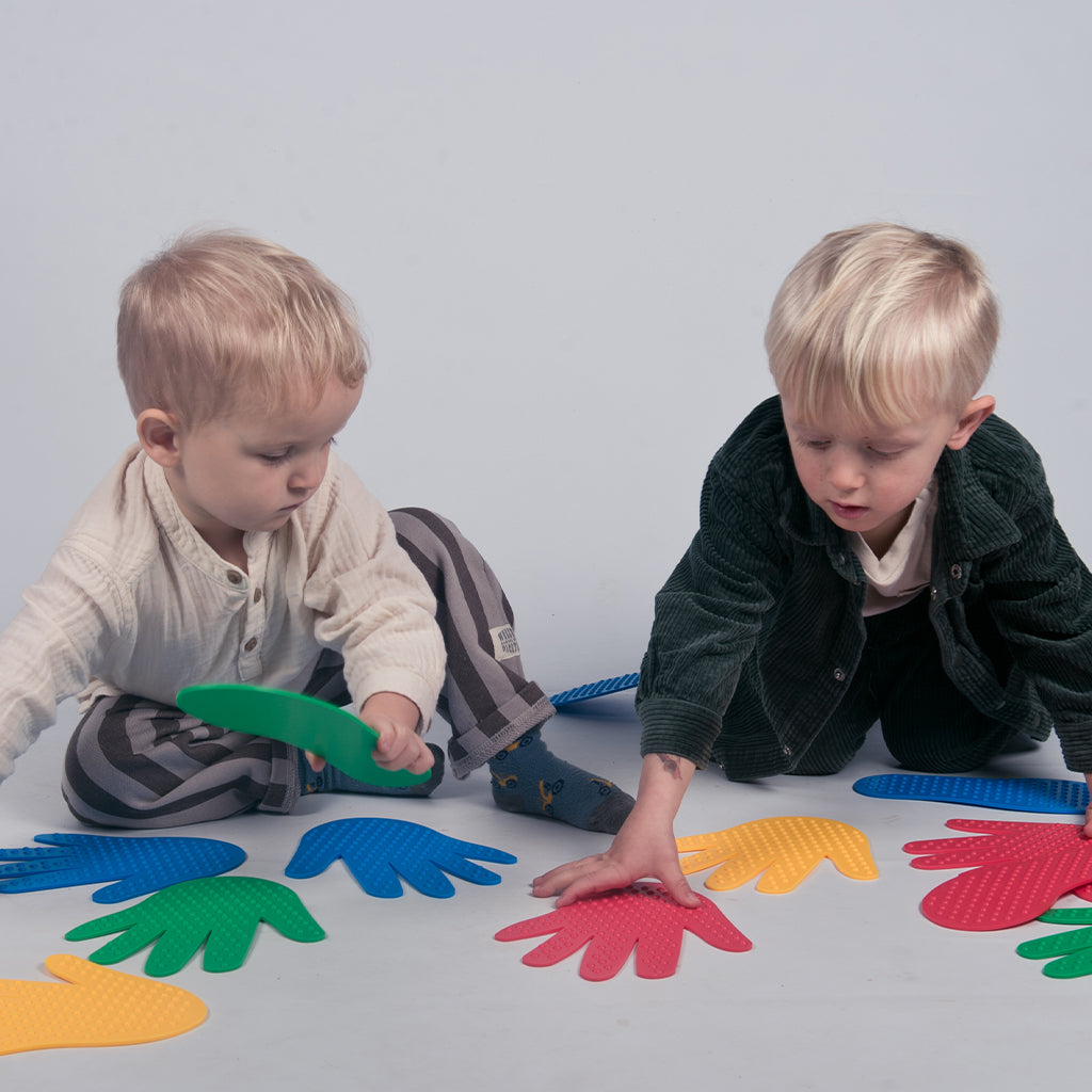 24 pieces of marking plates in the shape of hands and feet that create fun and interactive activities for color and shape recognition.