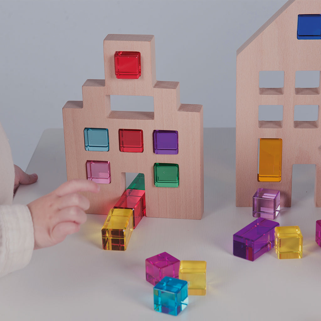 A sensory house with colorful acrylic blocks that create visual effects. Stimulate children's senses and curiosity by observing the colorful blocks. Ideal for use in preschools and playrooms to encourage fine motor skills, focus, and creative play.