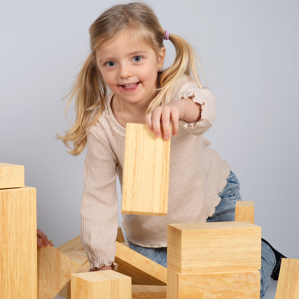 The large, wood-colored building blocks stimulate imagination, collaboration, and creative construction. The soft, sound-absorbing material makes play pleasant and safe, while children develop their spatial awareness and problem-solving skills. The blocks come in various shapes and in the colors red, green, blue, and yellow. The set includes 56 pieces in sizes from 8 to 32 cm.