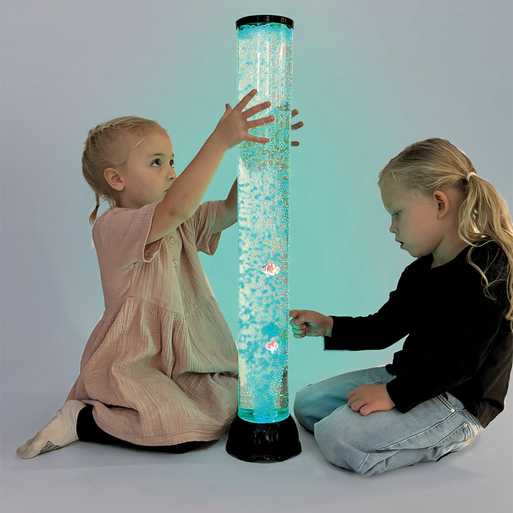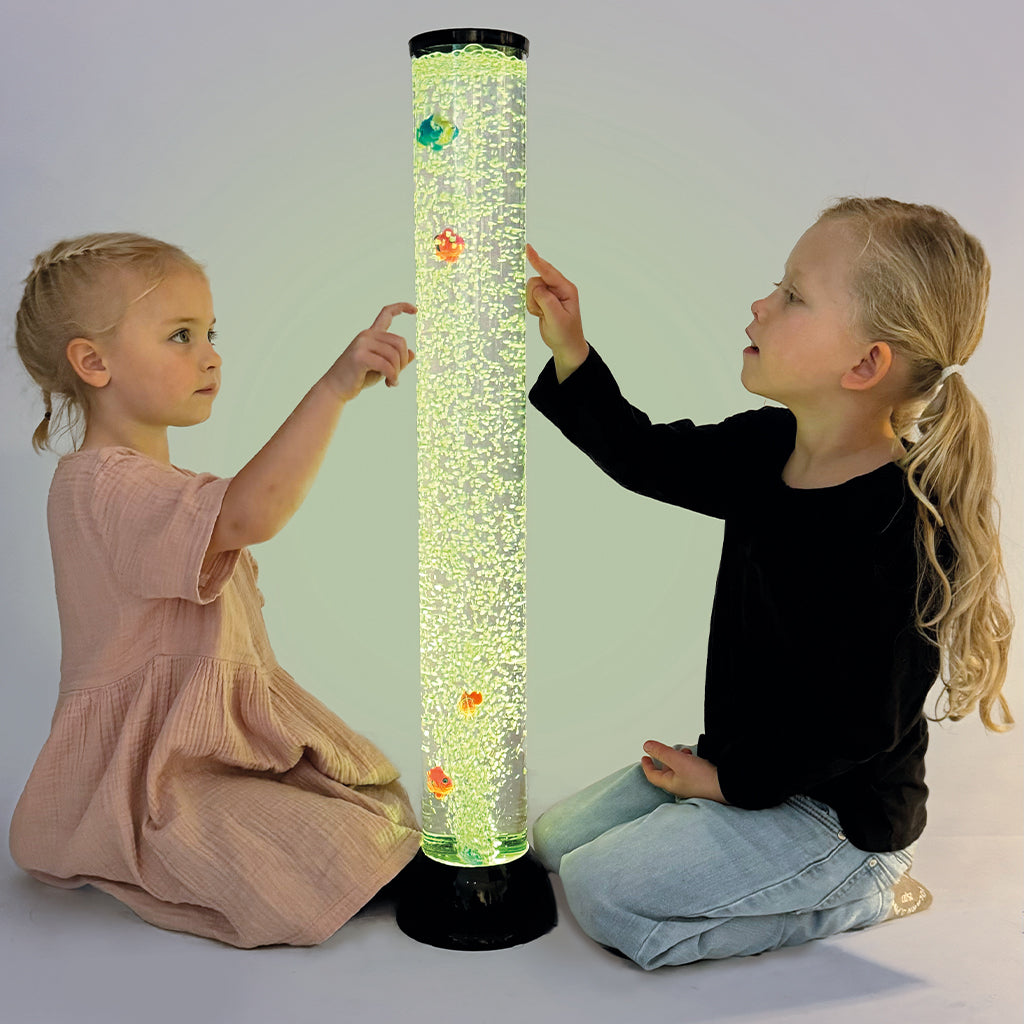 A calming bubble tube with colorful fish swimming up and down in time with the bubbles. A sensory experience that stimulates curiosity and provides a soothing effect. The lamp is powered by the included cord. Requires a power outlet.