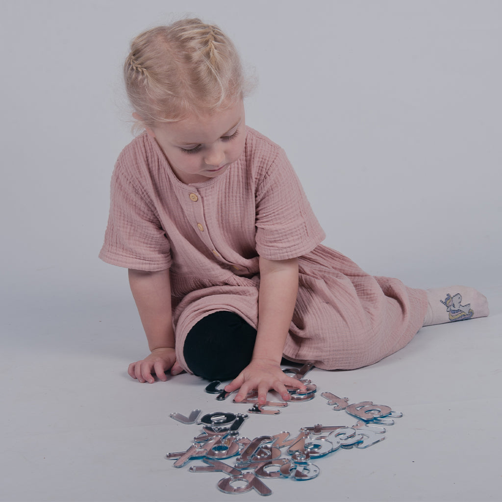 Double-sided mirror letters (A-Ö + Æ,Ø), 31st/pack. Used for learning letters, shows the shape of the letters, increases understanding of mirror reflections, and explores the letters from different angles. All letters have a 3 mm hole so they can be hung up, or used in e.g. mobiles or as window decoration etc.