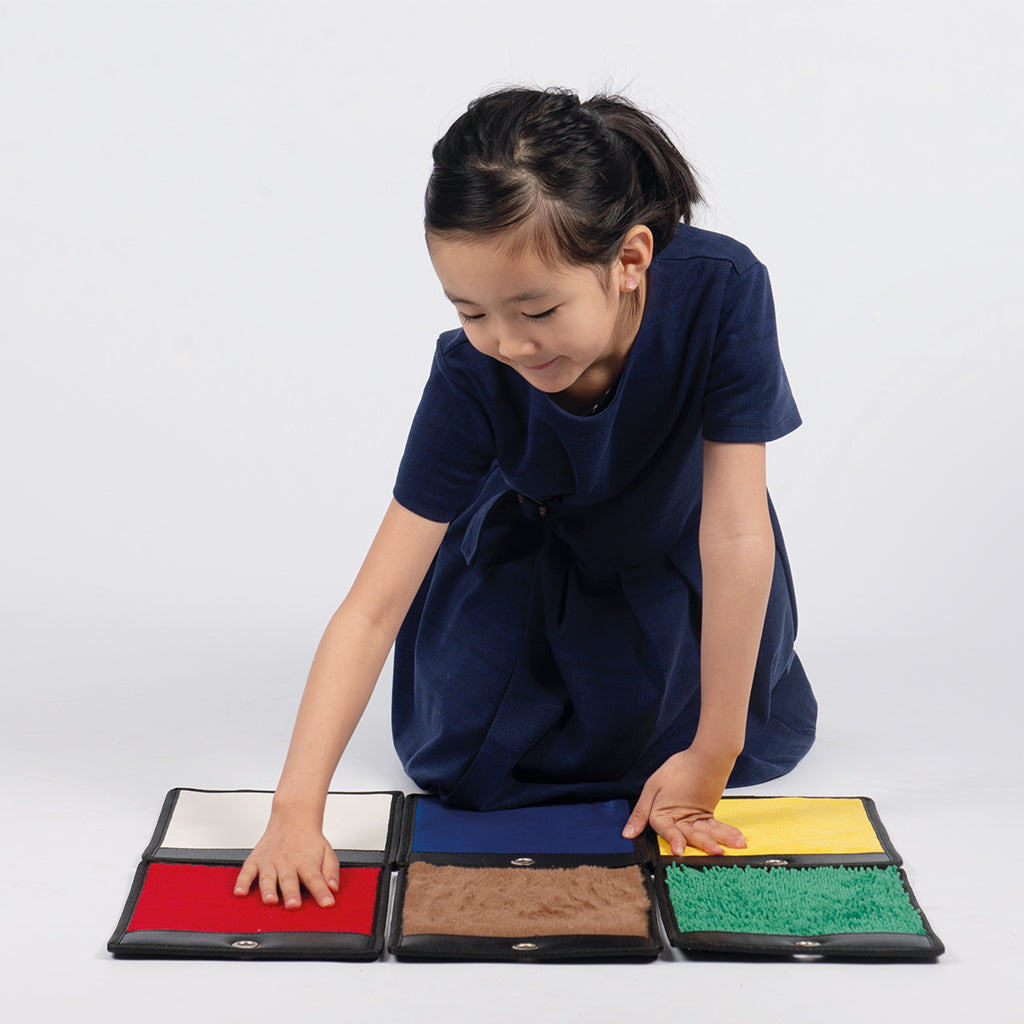 Sensory mini mats with 6 different tactile surfaces to explore and feel. They can be used on the floor for feet, on tables to feel with hands, or hung on the wall using hanging loops. Feel and describe the sensation of the different textures grass, fur, plush, snake skin, carpet, and waves. Non-slip on the back so they stay in place. From 3 years.