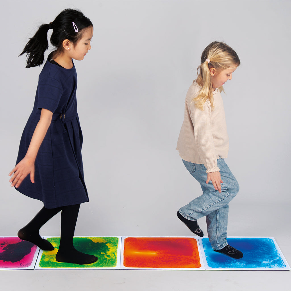 Sensory floor tiles in four different sensory-stimulating colors. The tiles encourage movement and exploration in various ways through jumping, pressing, and pushing on them. They are filled with a liquid gel that shifts under pressure, creating different patterns. They can also be used on a table, where they can be pressed with fingers. Available in 3 different sizes.