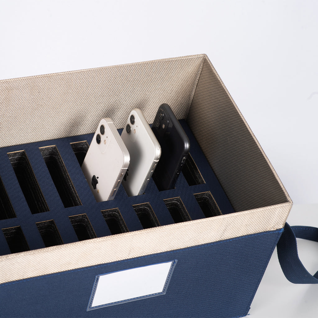 The box contains 16 numbered compartments and has two carrying handles. On the long side, there is a label pocket for clear marking of the classroom or meeting room. The phone box is a perfect tool to facilitate phone-free lessons, meetings, and conferences without interruptions. It helps increase concentration and presence. The phone box comes with a one-year warranty.