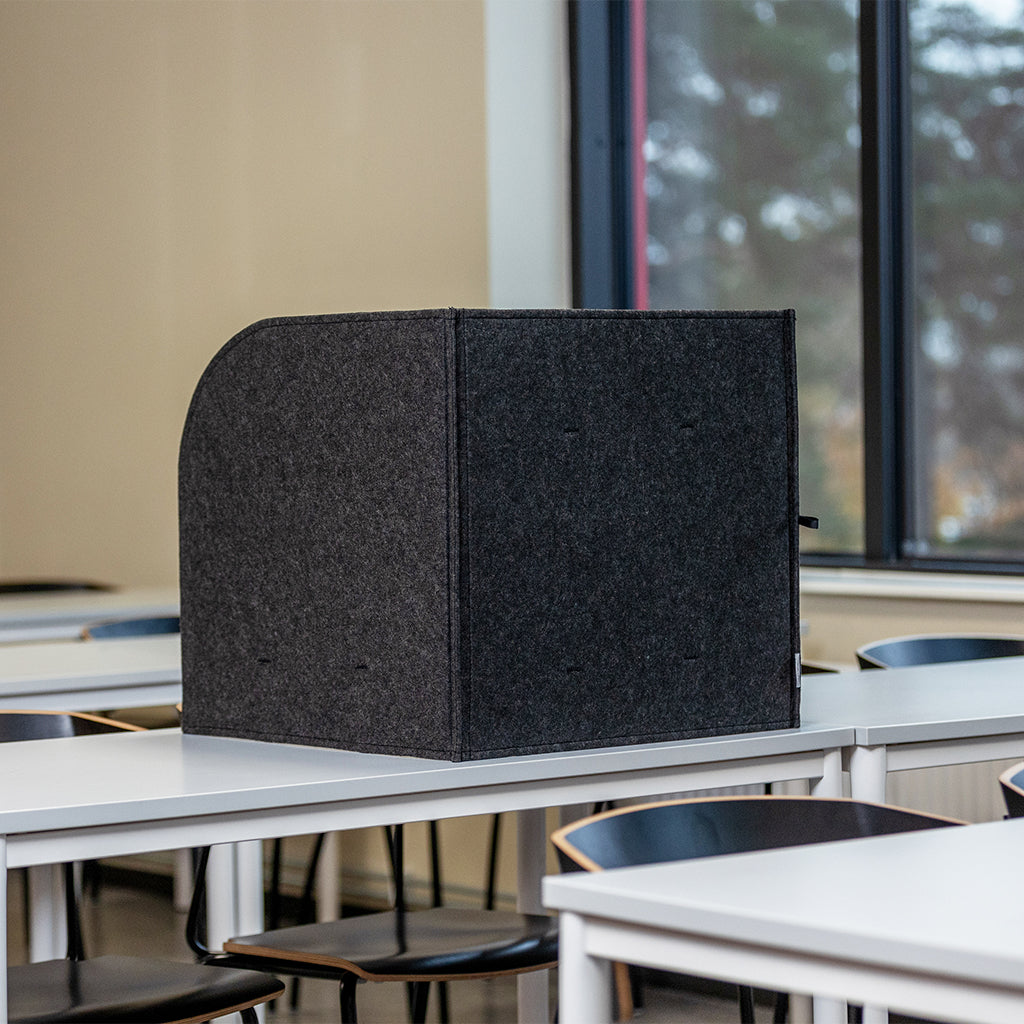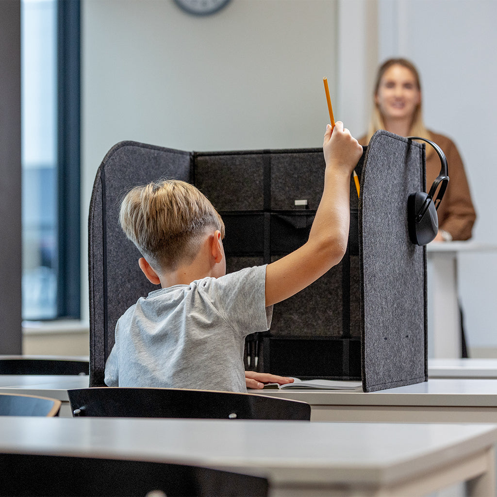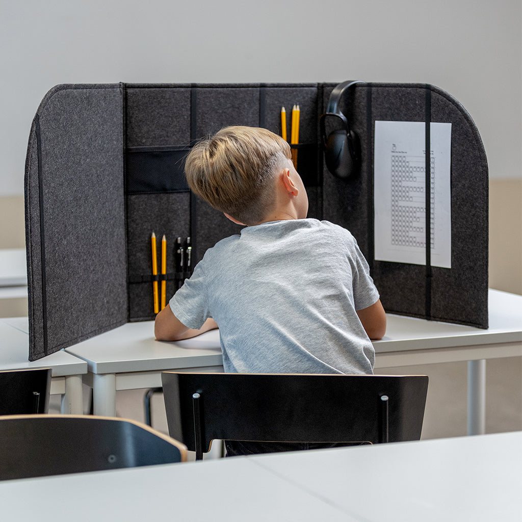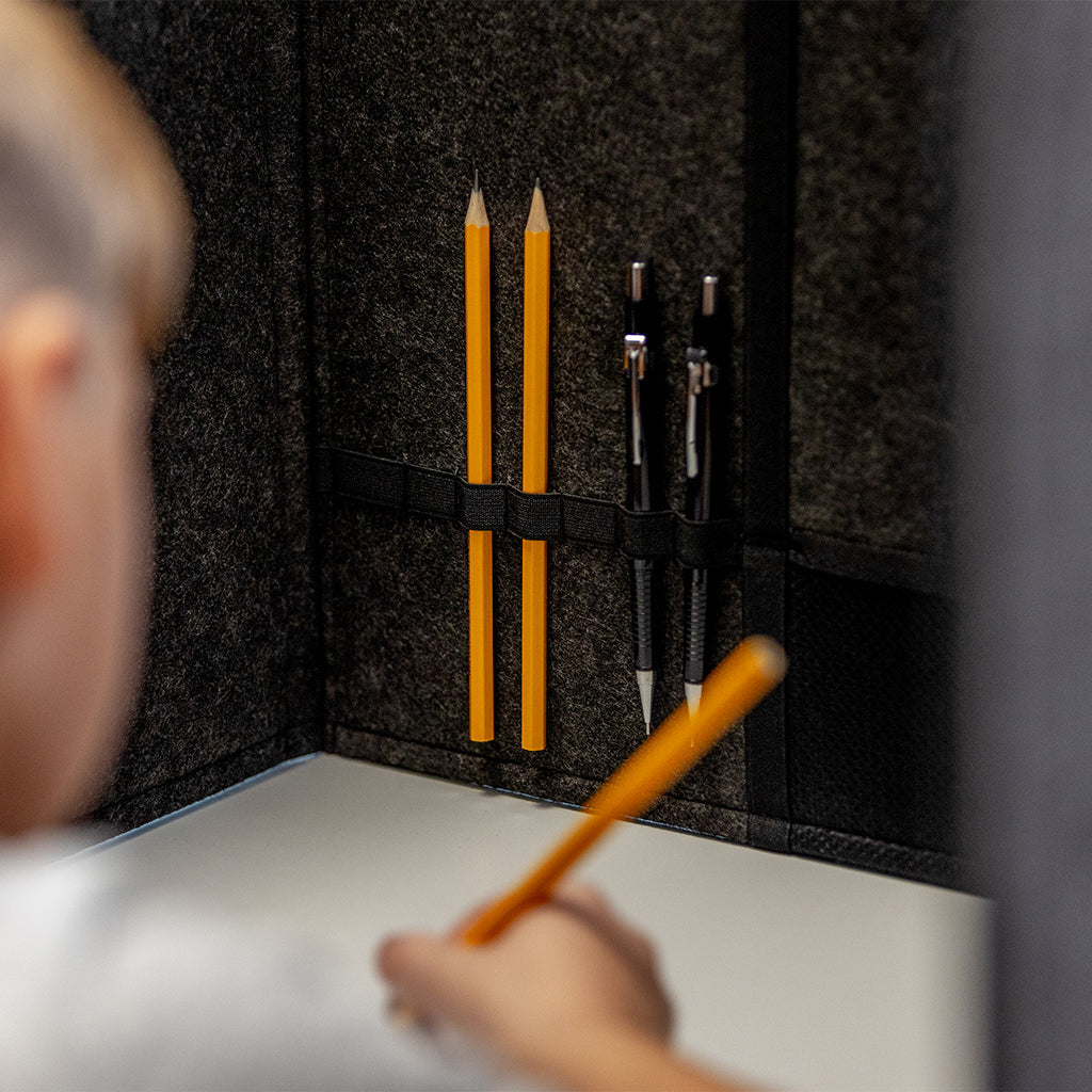 MyPauze sound-absorbing desk screen provides effective separation between students. Perfect for increased concentration and learning as well as during exams. The screen is equipped with storage pockets, a pencil holder, and straps for storing papers and study materials. The screen is mountable and foldable, making it a space-saving sound absorber. The product has Oeko-Tex® Standard.